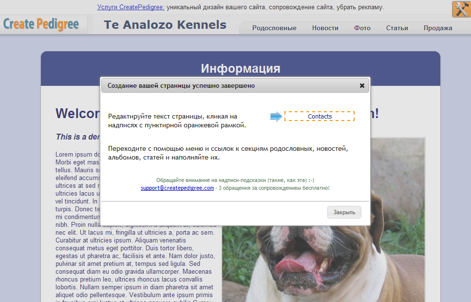 Если вас интересует создание сайта питомника на стандартном шаблоне (навыки дизайнер не нужны) или как наполнить страницы информацией, посмотрите материал Создание сайта питомника вместе с CreatePedigree.